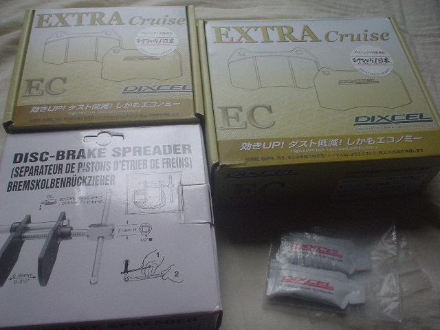 新しいブレーキパッド1台分とディスクブレーキピストン戻しツールと部材が揃ったので作業をすることに