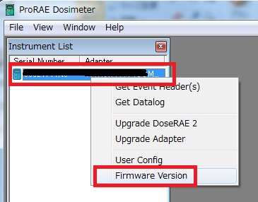 管理ソフトで認識されたDoseRAE2を右クリックして「Firmware Version」をクリック