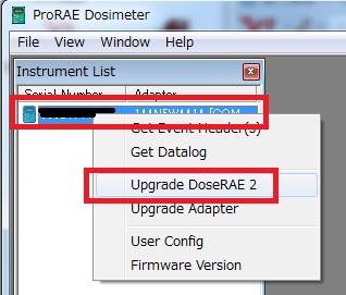 管理ソフトで認識されたDoseRAE2を右クリックして「Upgrade DoseRAE 2」をクリック